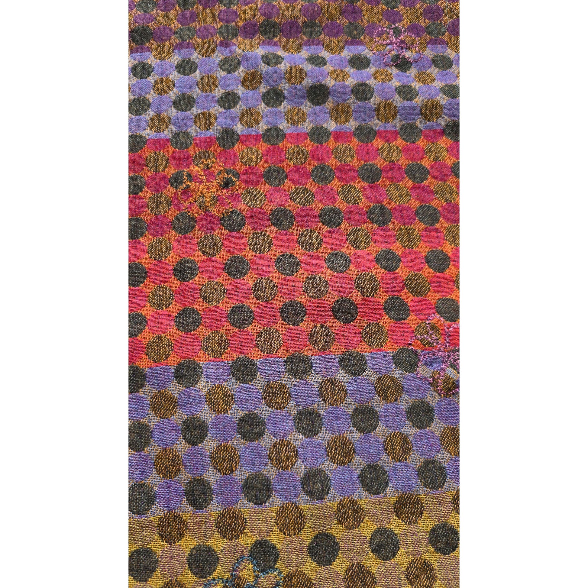 Rich palette of reds, purples, yellows, and turquoise in both the embroidery and polka dot weave.