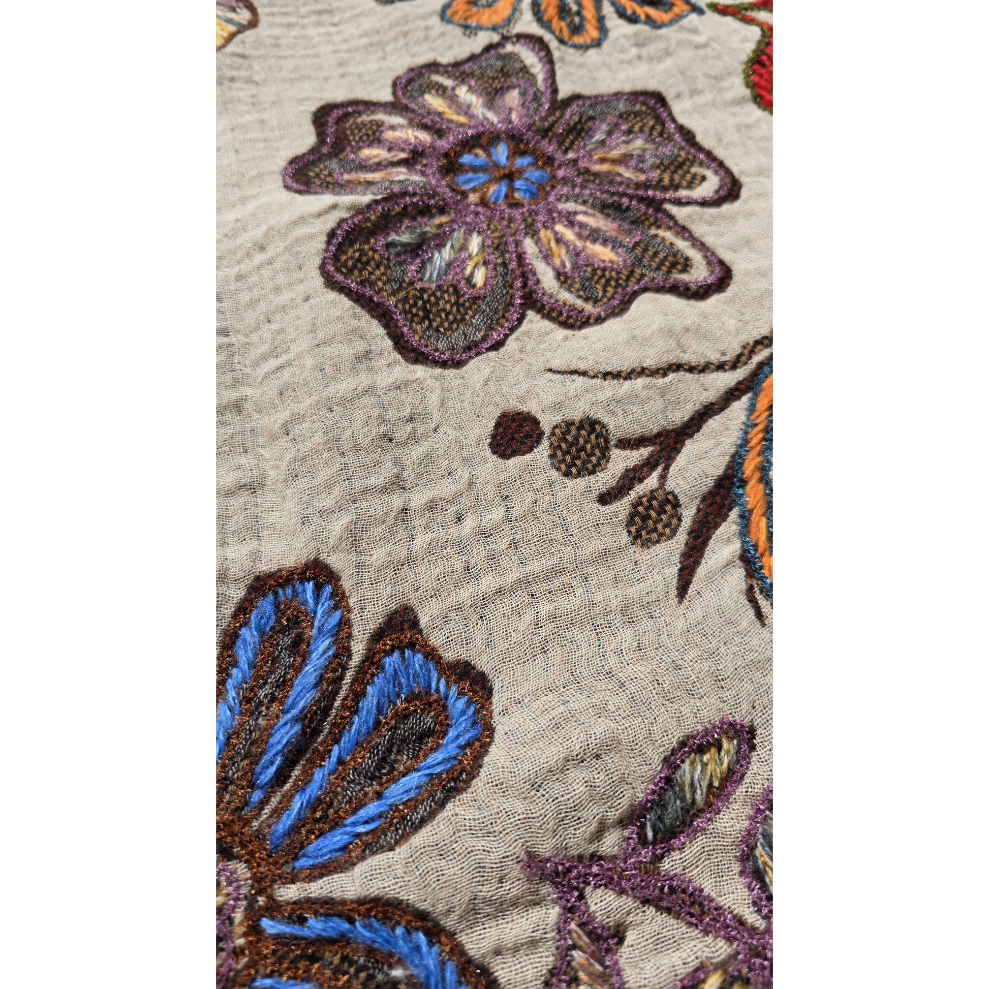 Handmade detailed floral embroidery in vivid shades of blue, red, orange, purple, and green.