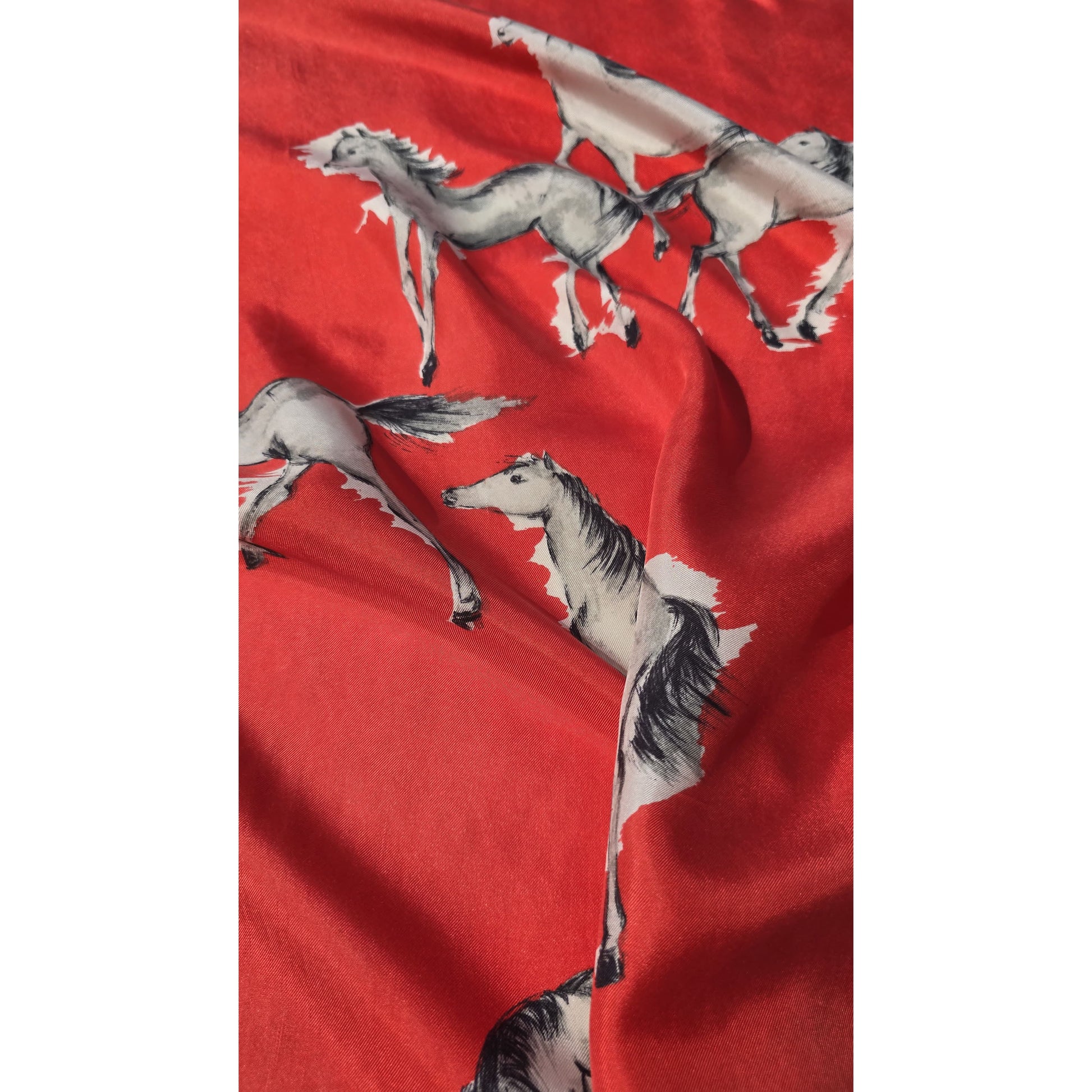 Design: The scarf features a vivid red background with a repeating pattern of prancing horses in shades of black, white, and gray. The artwork is dynamic, capturing the movement and elegance of the horses.