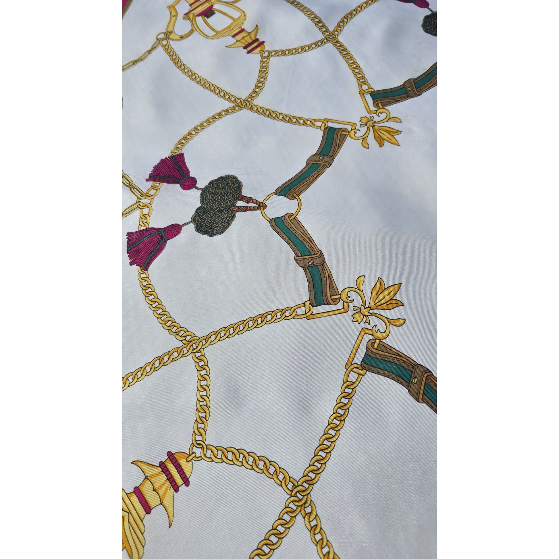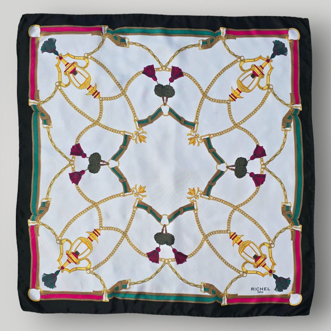 This Richel Paris scarf stands out for its classic design, high-quality silk, and well-preserved vintage condition. It is a collectible accessory suitable for both wear and display.