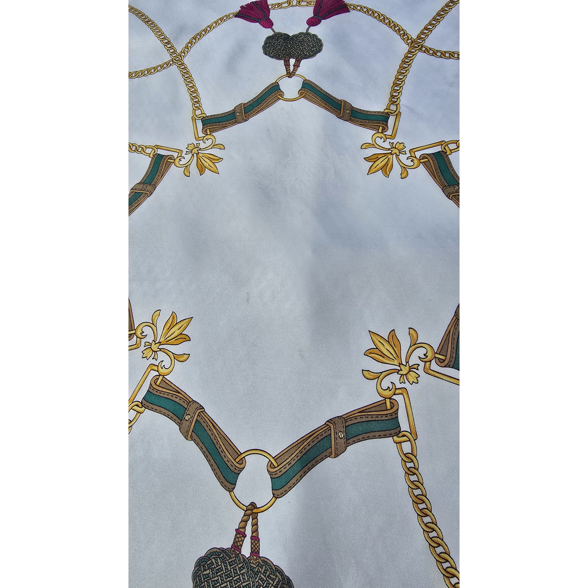 Design: Features an ornate motif with golden yellow leaves, decorative ropes, and equestrian-inspired elements in gold, brown, and green tones. The design is classic and elegant, reflecting vintage Parisian style.
