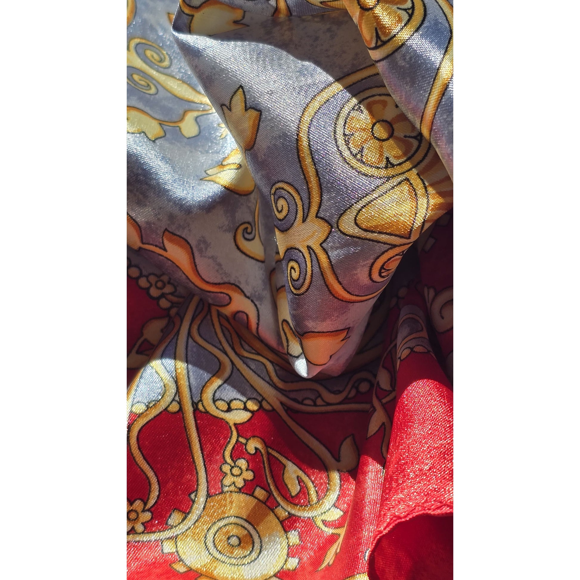 Features iconic Renaissance ornamental design, signed in the print and with a stitched brand label. Silk-like finish, easy-care polyester, drapes beautifully for neck or headscarf styling.