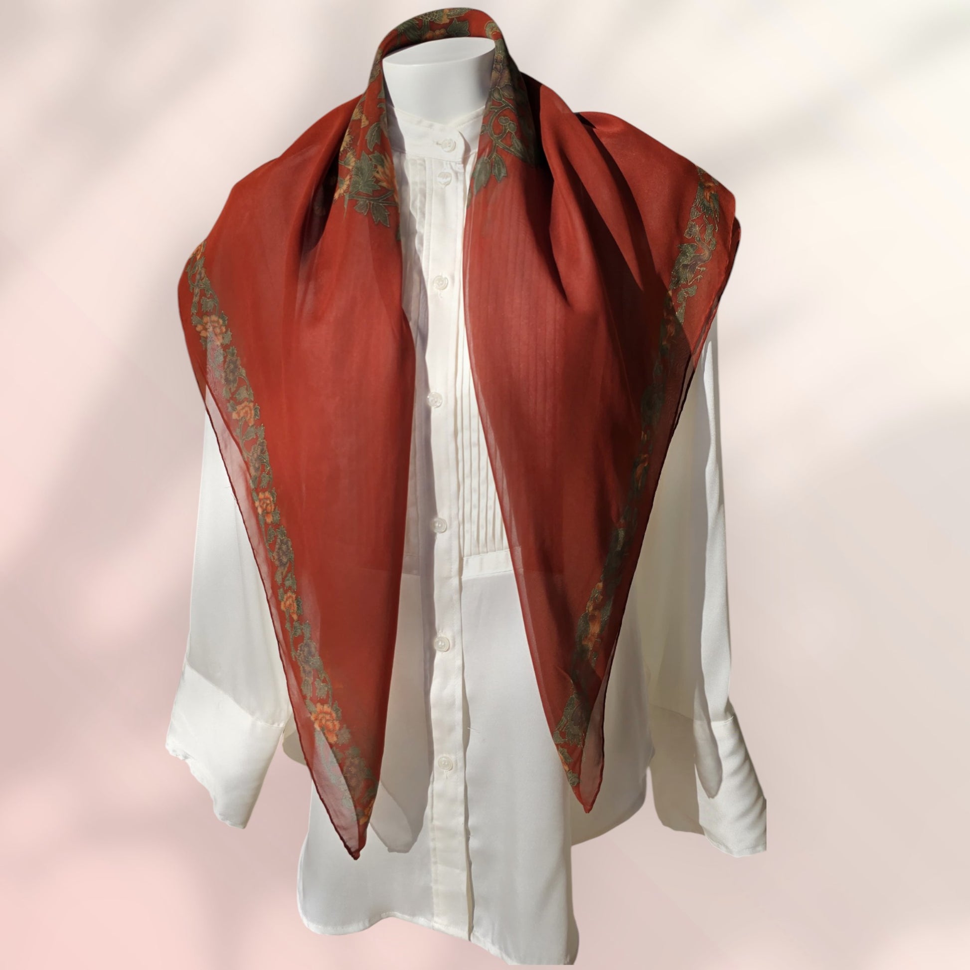 The base is a rich, burnt orange-red, accentuated with muted greens, golds, and purples for an elegant autumnal palette.