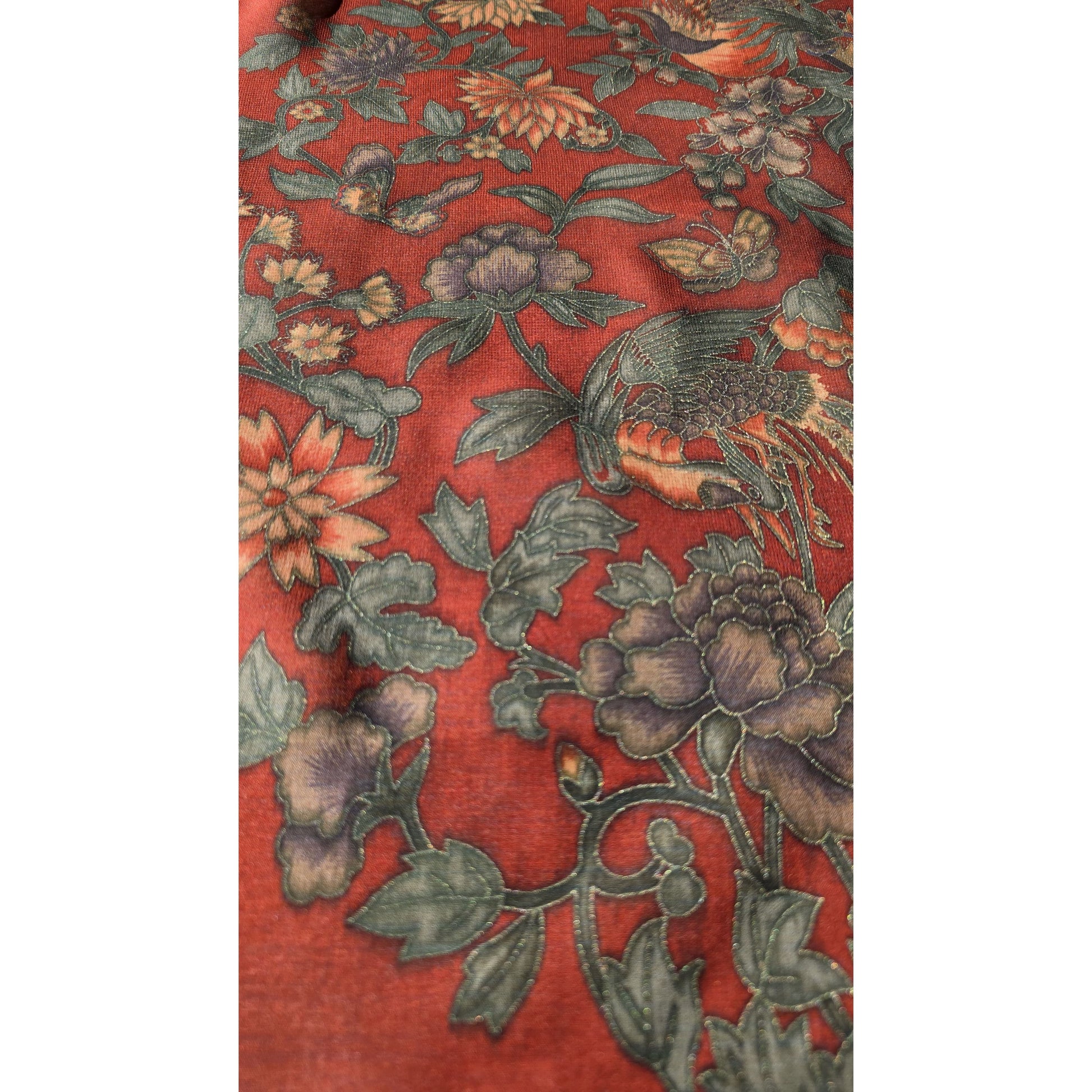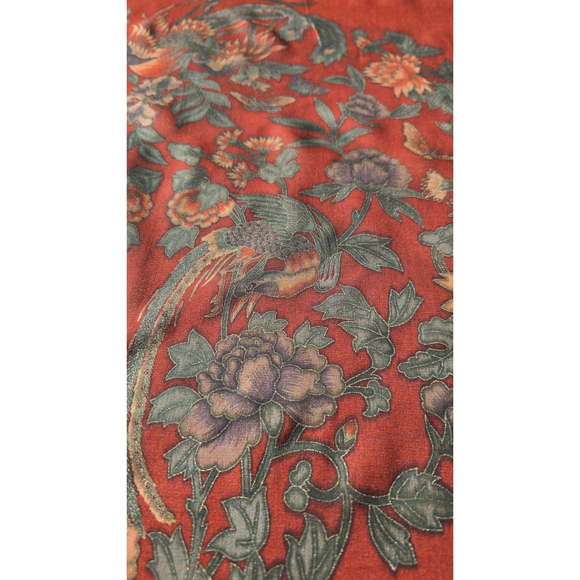 Bring home a rare piece of Italian luxury with this authentic vintage Gianni Versace silk scarf, crafted in Italy and showcasing a stunning Art Nouveau-inspired floral motif with peacocks and stylised foliage.
